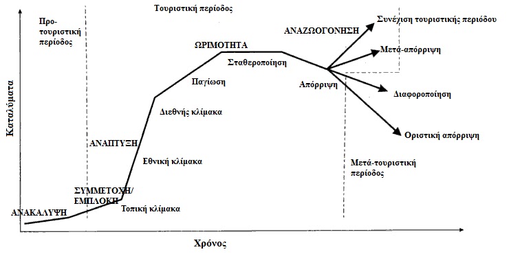 Κάθε τουριστικός προορισμός ακολουθεί ένα κύκλο ζωής. Τα στάδια του κύκλου αυτού είναι κατά τον Butler (Butler, 1980 στο Andiotis, 2005) αυτά που φαίνονται στο σχήμα. Σε ένα κλασσικό κύκλο ζωής, η μετάβαση συμβαίνει από τη γέννηση στο θάνατο. Μετά τη φάση της απόρριψης, μπορεί ένας προορισμός να ακολουθήσει τη φάση της αναζωογόνησης ή επανάκαμψης -ακολουθώντας τις τεχνολογικές εξελίξεις, βελτιώσεις υποδομών ή την ανάπτυξη εναλλακτικών μορφών, τη φάση του περεταίρω κορεσμού και της μη αειφορικής ανάπτυξης, ή τη φάση της απόλυτης παρακμής.